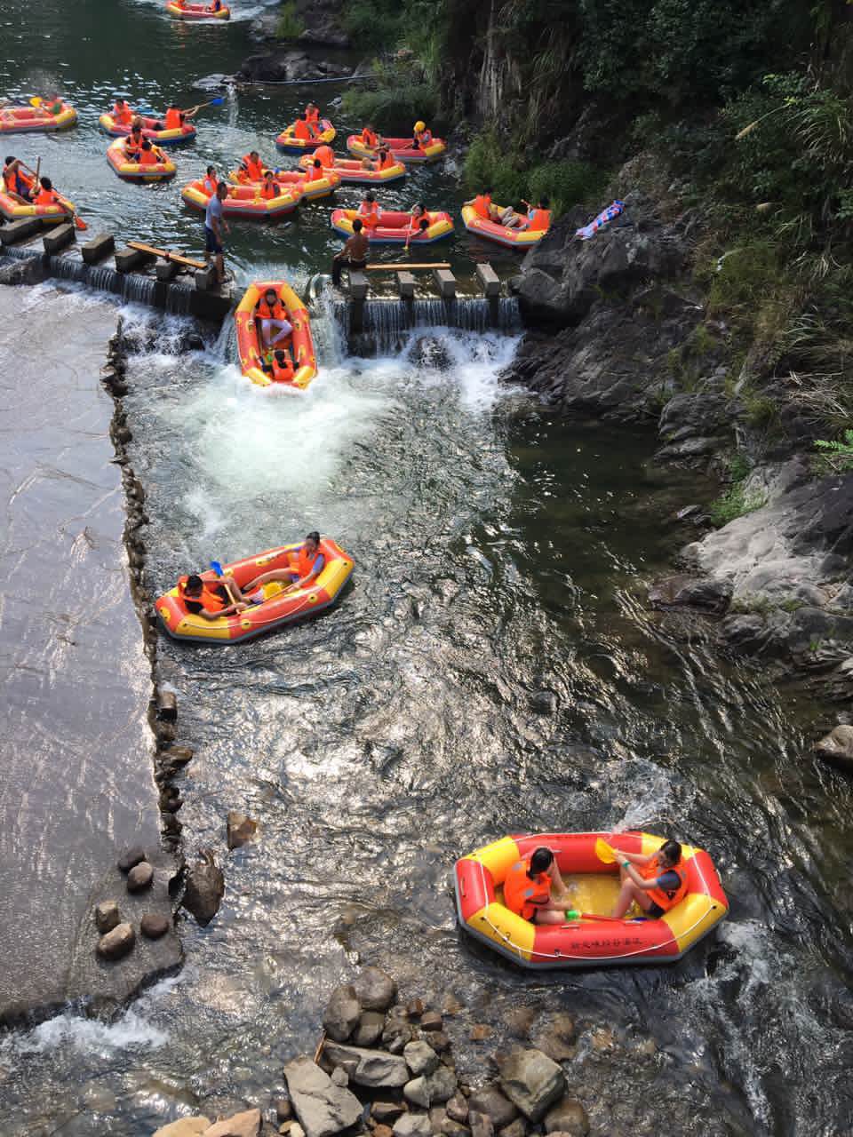 经过4个半小时的车程,我们到达了丽水松阳县,简单的用过午餐后,就前往新处峡景区,这里的绿谷漂流长约3公里,落差约60余米;由高落差、急流险滩、缓流戏水等自然资源与景观相组合。漂流过程中虽然意外频发,但多是有惊无险,而且大家兴致高昂,笑声多多,畅游山水间,打水仗、漂流、嬉戏,我们在水上疯玩了两个多小时,上岸时,都已经是浑身湿透,筋疲力尽了。