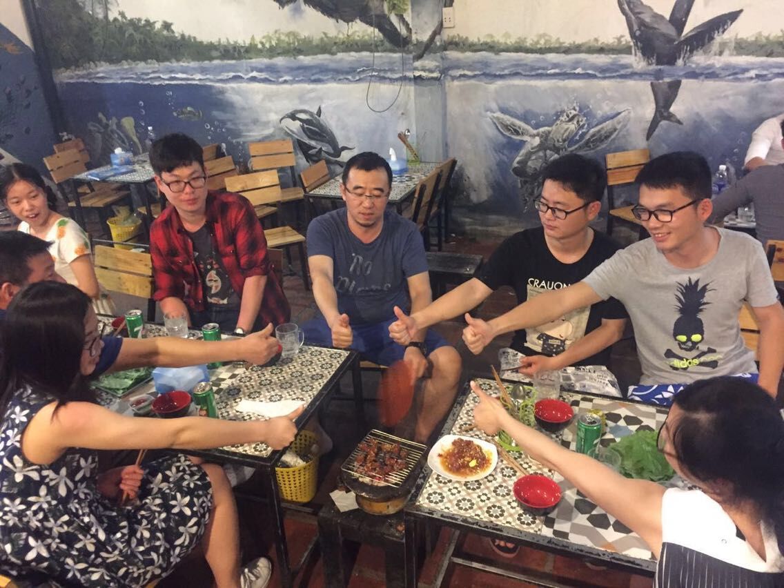 看完演出大家意犹未尽,在岘港街上找到了当地有名的越南烧烤店,西春烧烤。这里的服务员都不会中文,我们的保安队长甘维伦用他出色的口语能力和我们孟总丰富的肢体语言,为我们点上了丰盛的夜宵。