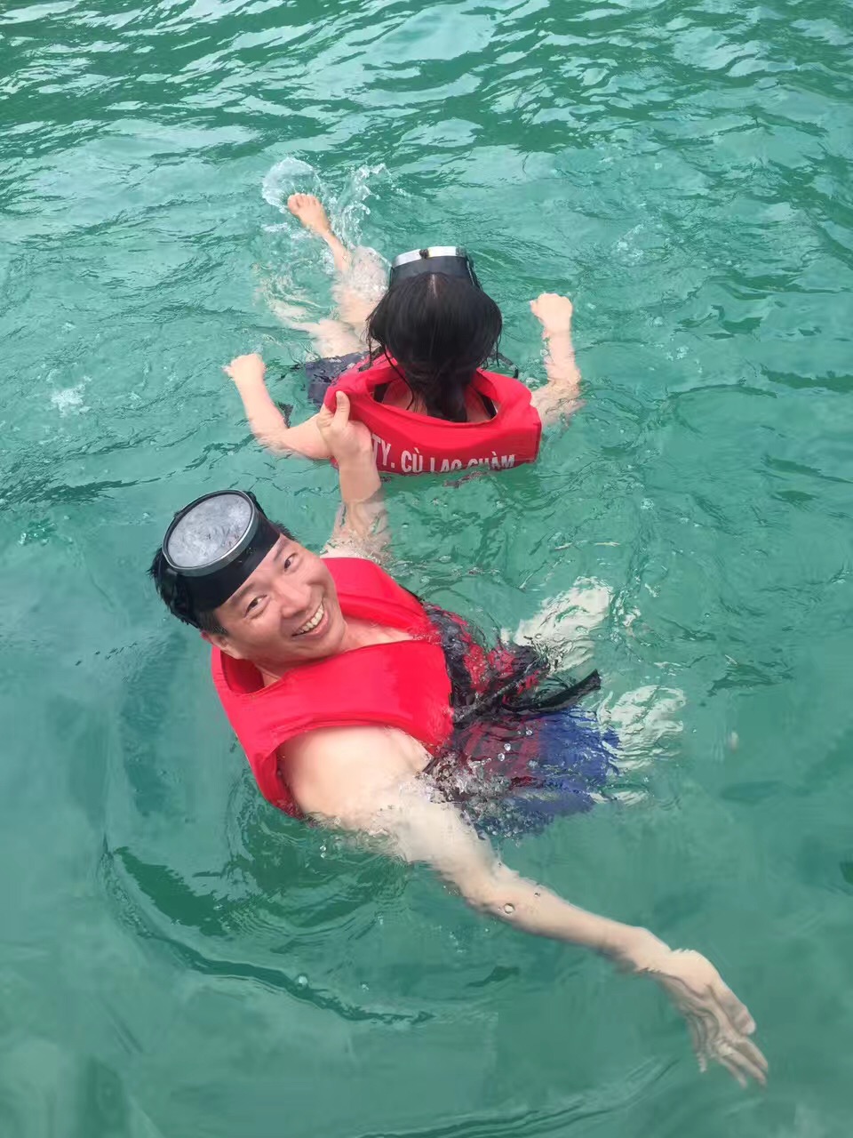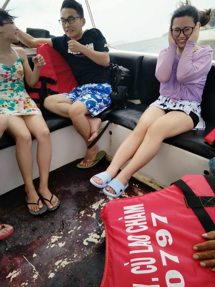 第二天,我们集体出发前往岘港原生态的海岛--占婆岛。大家在酒店集合后到了会安码头,码头上停靠了众多快艇、潜水艇。上了快艇后,快艇随即在水面上开始飞行,俗话说车头船尾。虽说船尾并不颠簸,但是一阵阵的海风吹来加上飞溅起来的海水,船尾的小伙伴尖叫连连浑身湿透