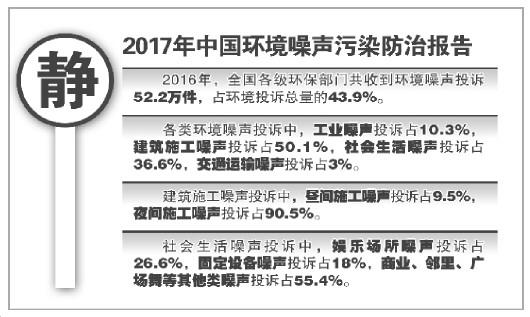 值得注意的是,2016年,全国各级环保部门共收到环境噪声投诉52.2万件,占环境投诉总量的43.9%。各类环境噪声投诉中,工业噪声投诉占10.3%,建筑施工噪声投诉占50.1%,社会生活噪声投诉占36.6%,交通运输噪声投诉占3.0%;在建筑施工噪声投诉中,昼间施工噪声投诉占9.5%,夜间施工噪声投诉占90.5%。