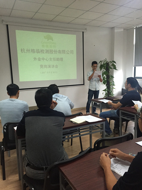 为鼓励公司内部人才的合理流动和有效配置,建立人才平等竞争、优胜劣汰的激励机制,以适应公司快速发展的需求,同时有利于员工的个人成长,发挥员工工作积极性和主动性,杭州格临检测股份有限公司于2017年9月30日开展了外业中心主任助理的竞岗选拔活动,公司中高层和全体外业中心人员参加活动。